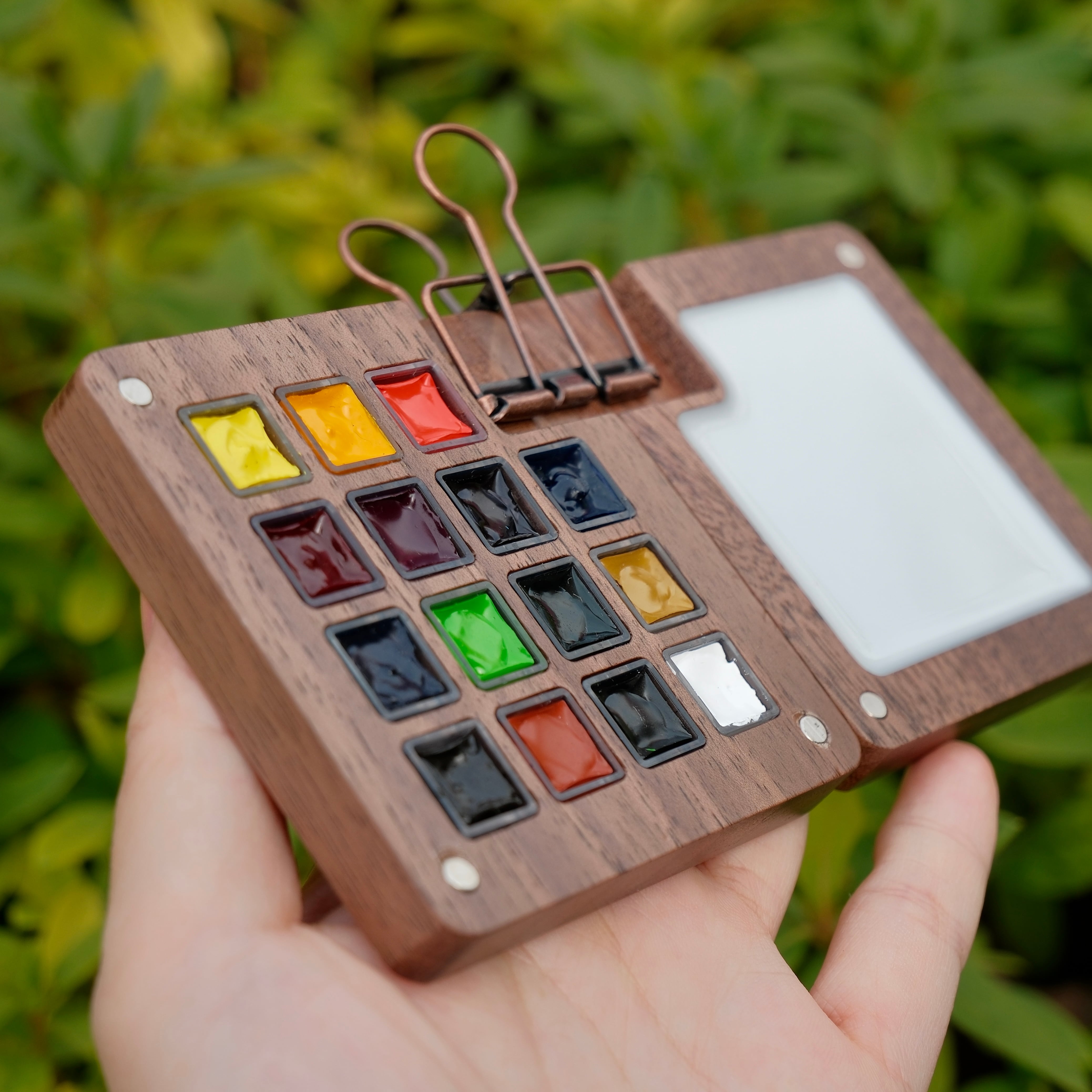Its magnetic design makes it extremely compact and easy to carry. You can clip it directly onto your sketchbook or drawing board. When you've used up all the paint, you can refill it by squeezing in your own tube watercolors.